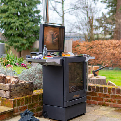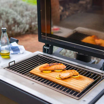 A pair of discreet doors are cleverly designed to protect the chef from the heat of the fire and the glass from grease splashes. These doors can then be put into the open position for an uninterrupted view of the fire in heat-mode. The combustion technology harnessed from our indoor wood-burning stoves has been ingeniously adapted, affording an unparalleled degree of temperature control tailor-made for barbecues.