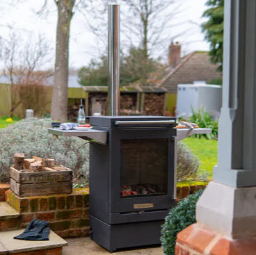 The strategic air supply design leads to significantly reduced smoke production compared to other solid fuel outdoor heating and cooking devices. Through a short flue pipe, the minimal smoke that does arise is directed away from the unit and its surroundings.