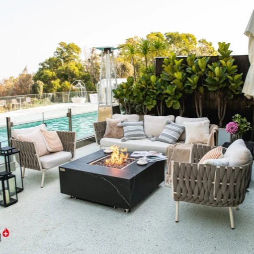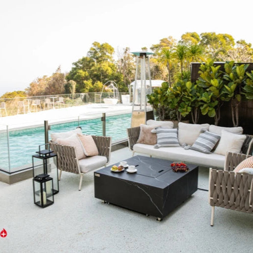 Experience luxury outdoor living with the Sofia Black Marble Porcelain Gas Fire Pit Table.