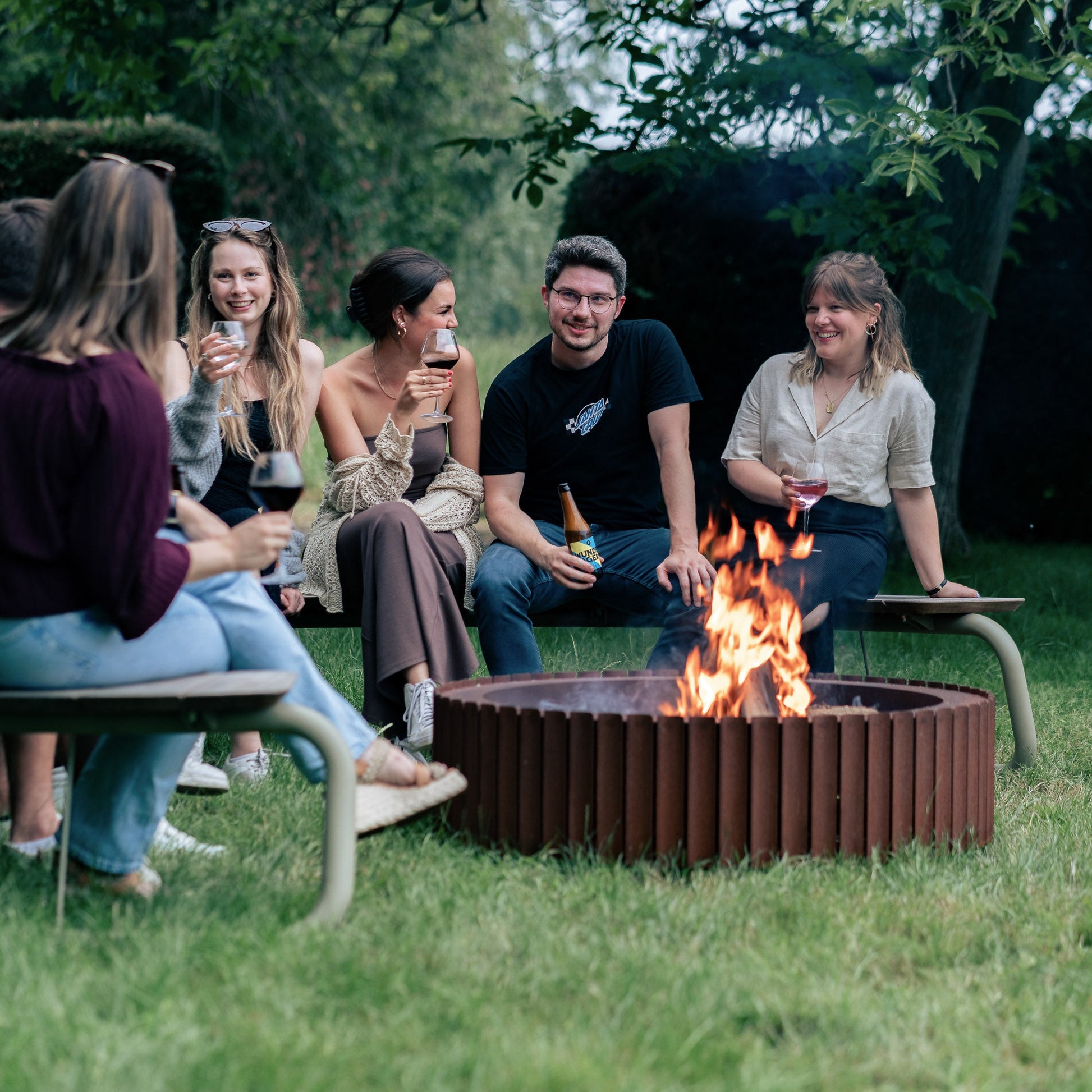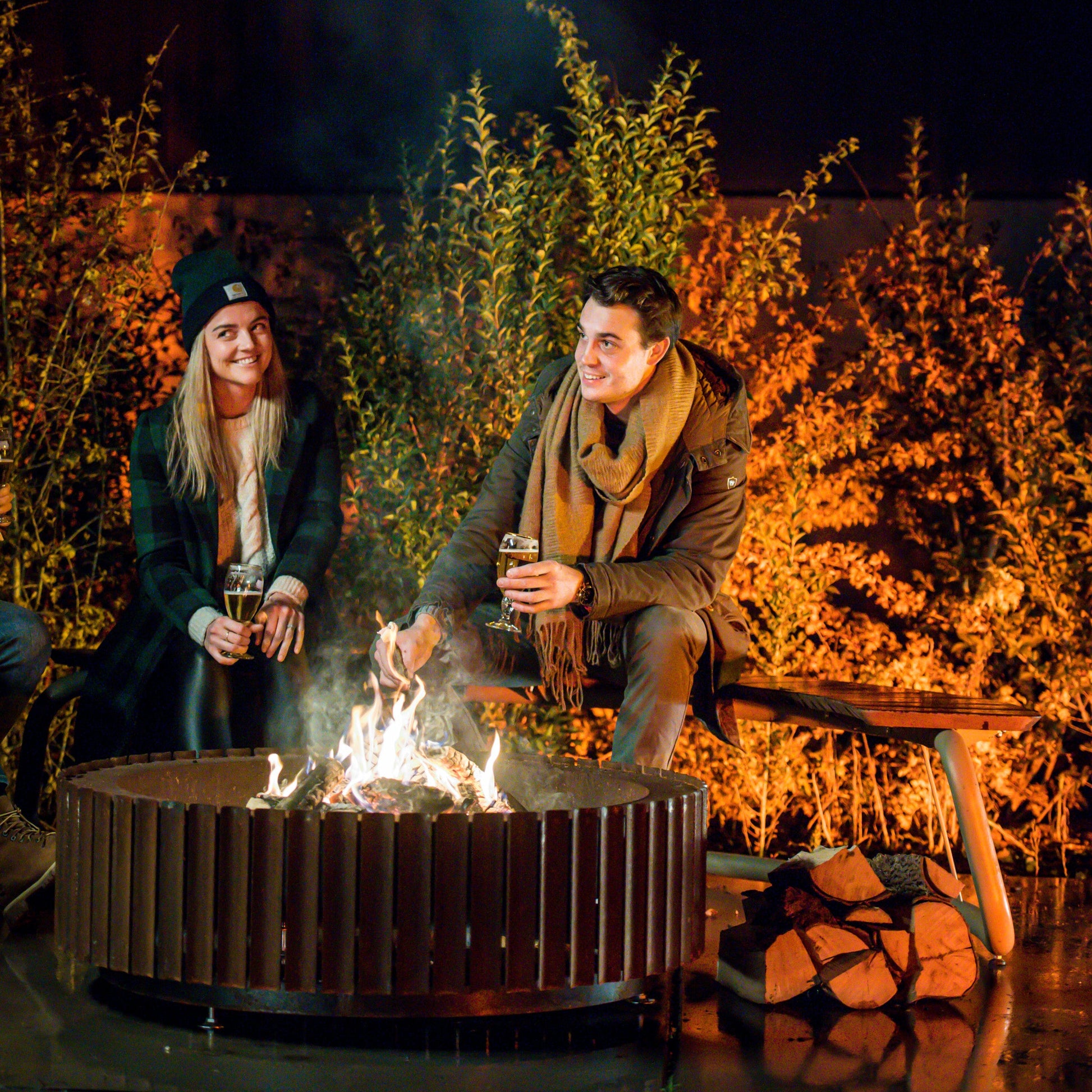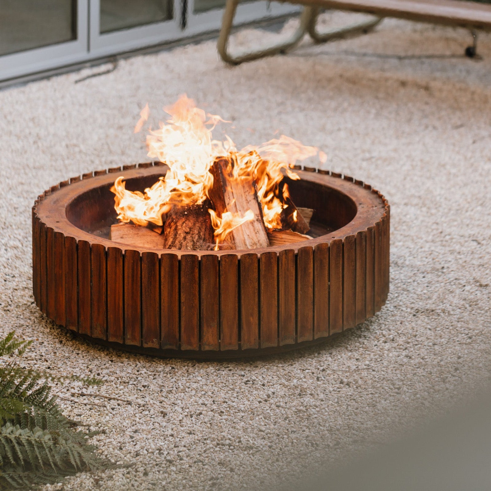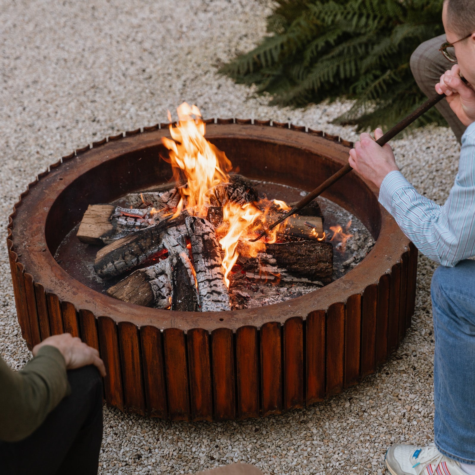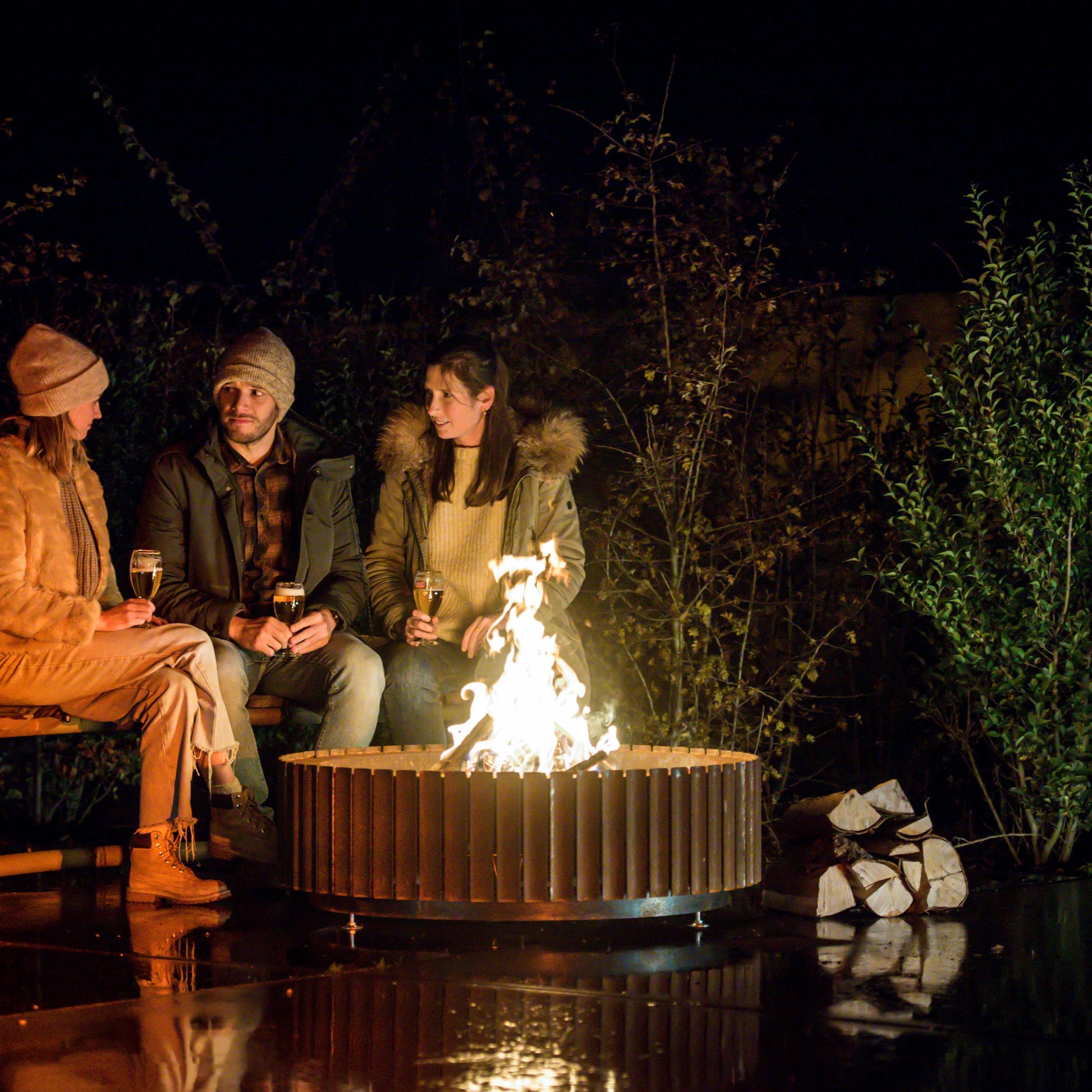 Welcoming, warm, and solid. Fire bowl The Ring is a rough beauty with a sweltering hot heart. Its curved shape with vents between the slats providing extra oxygen for the fire, makes a good, hefty flame and little to no smoke.