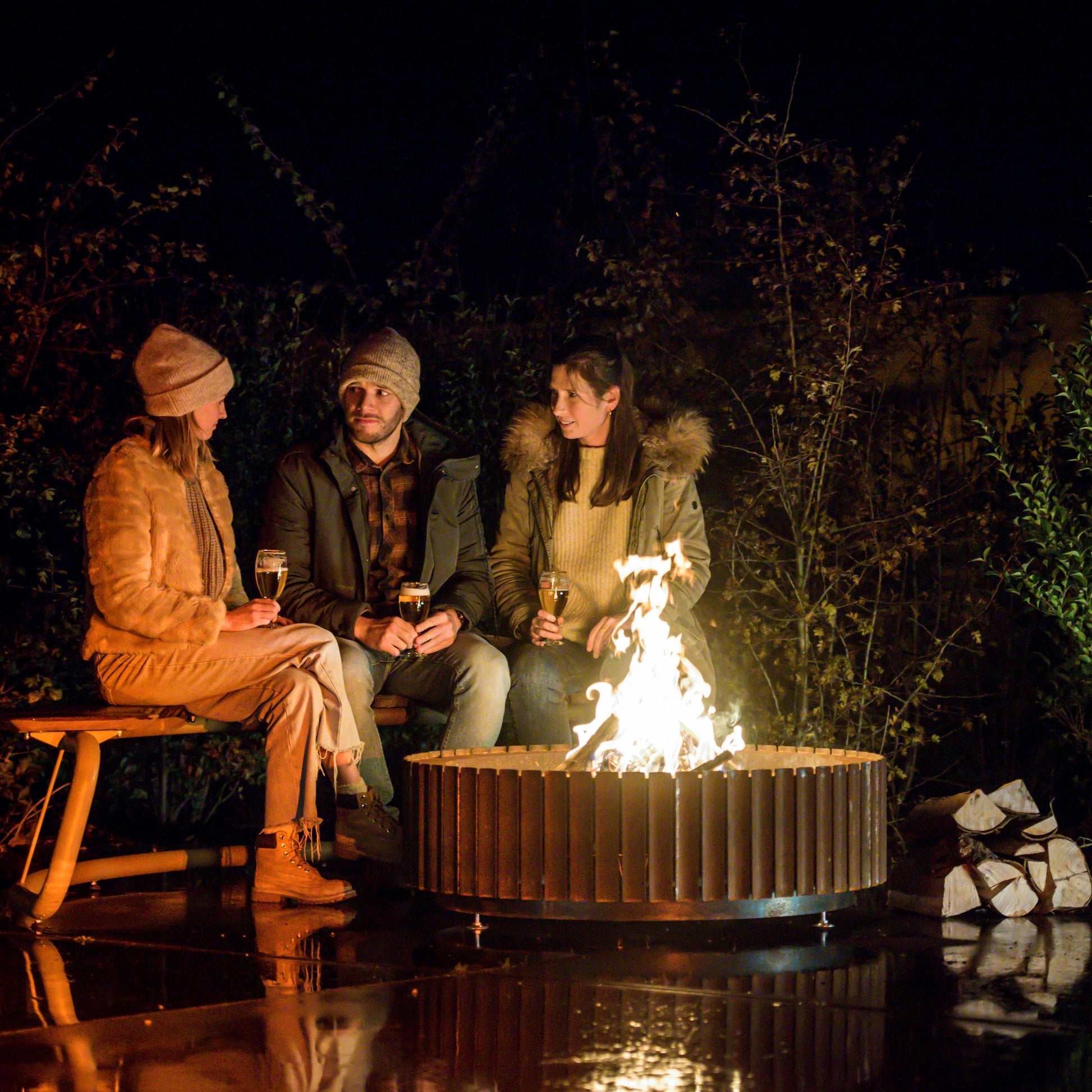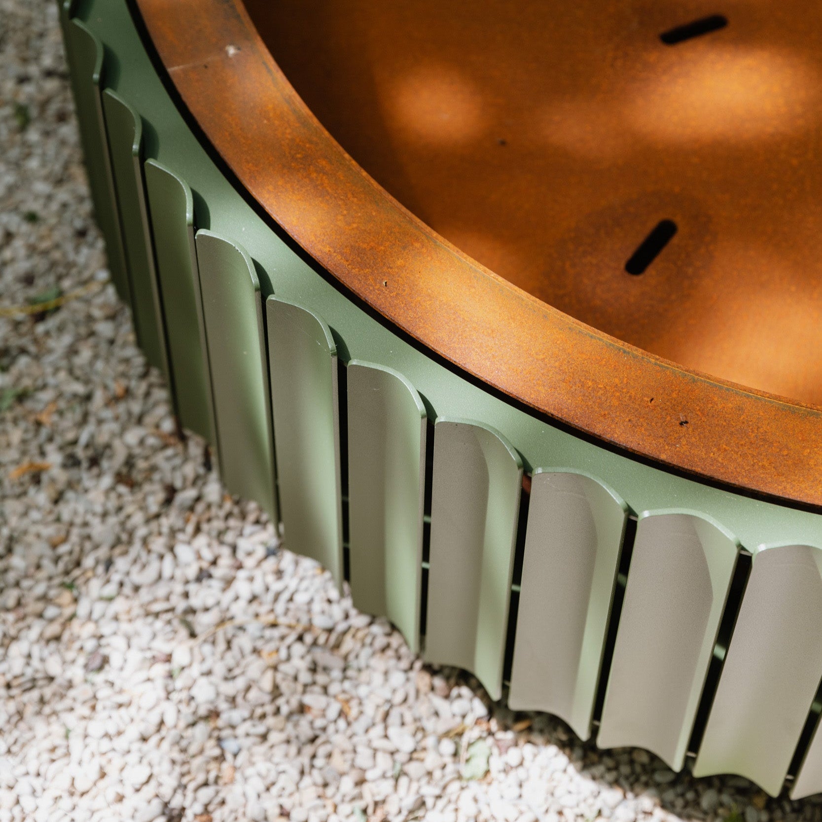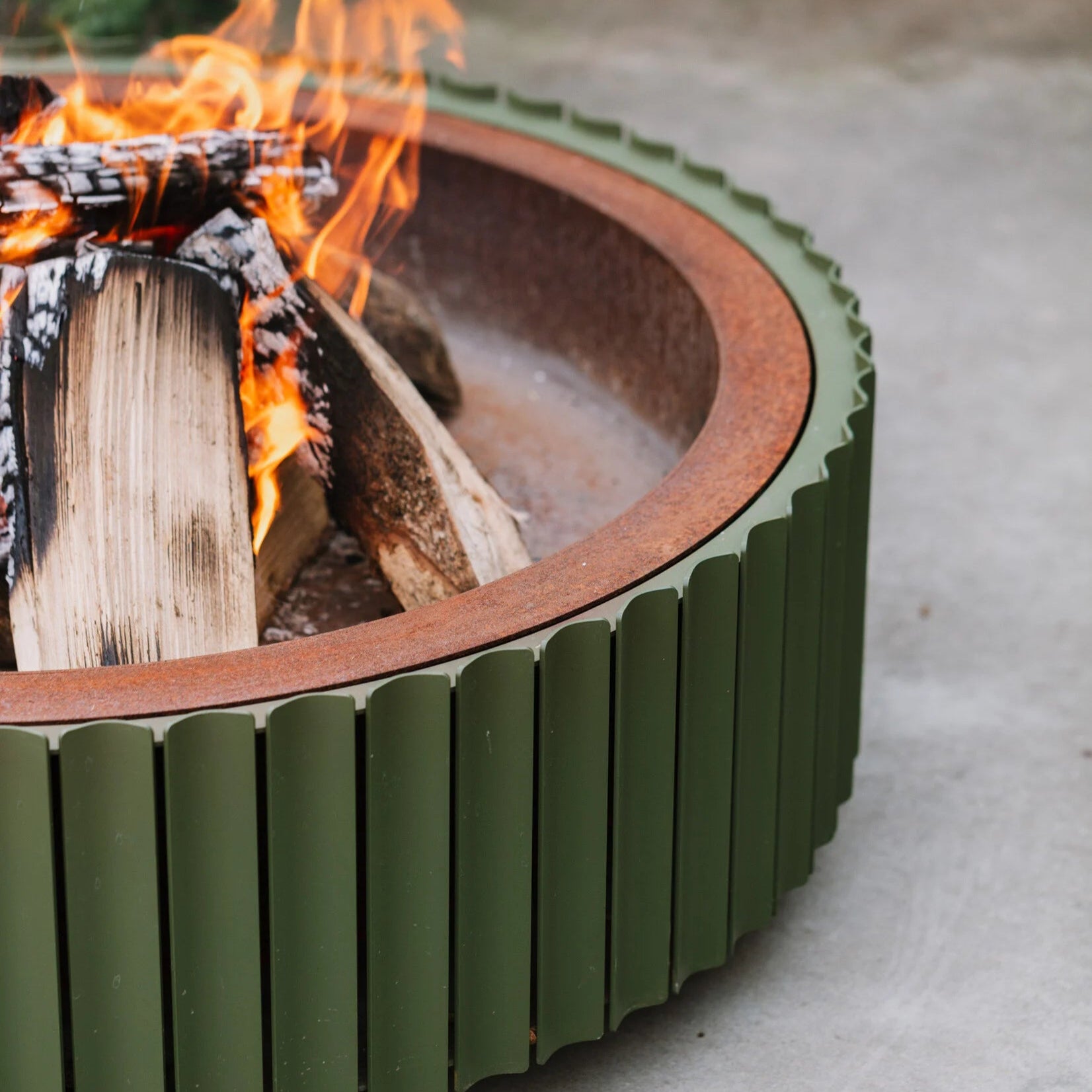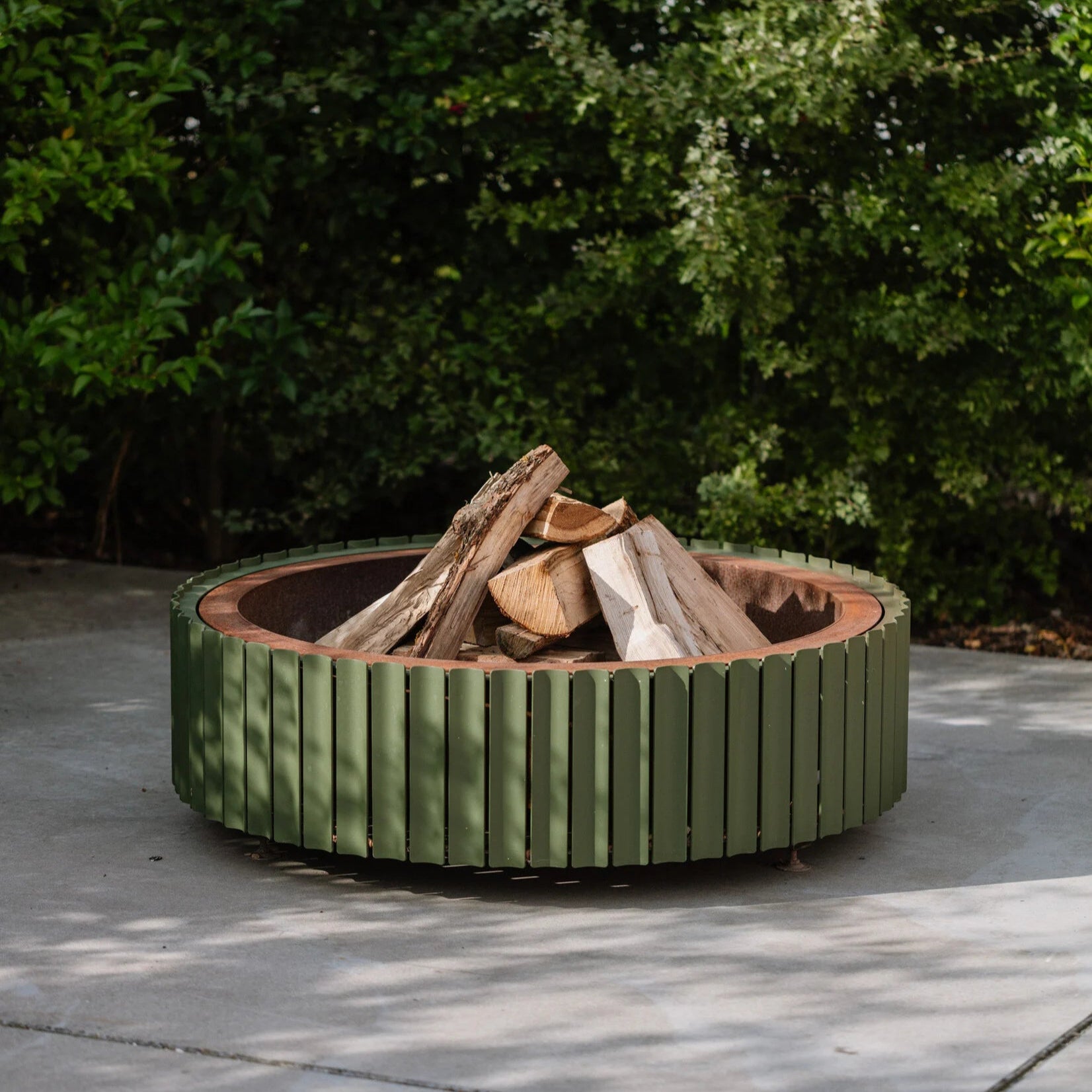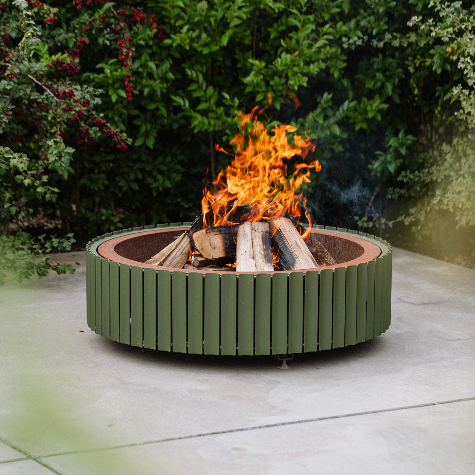 Welcoming, warm, and solid. Fire bowl The Ring is a rough beauty with a sweltering hot heart. Its curved shape with vents between the slats providing extra oxygen for the fire, makes a good, hefty flame and little to no smoke. This fire bowl is crafted from high-quality green powder coated steel.